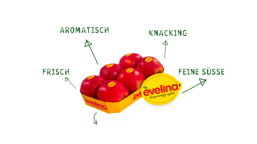 Colore: La colorazione dei frutti è più precoce e molto più intensa rispetto a Pinova standard. Il sovra colore è rosso/arancio, striato-slavato su almeno 80% della superficie del frutto. Buona colorazione dei frutti anche nelle parti ombreggiate della pianta.